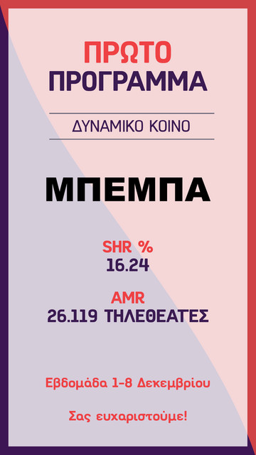 Αξίζει να τονιστεί ότι η “Μπέμπα” ήταν το κορυφαίο πρόγραμμα της εβδομάδας για τους νέους ηλικίας 18-44, κοινό το οποίο αποτελεί δυναμικό και άκρως ενδιαφέρον για την διαφημιστική πίτα.