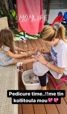 Η ίδια στην αυλή μαζί με την μικρή Μελίνα, την οποία έχει πια ως… κολλητή, παίζουν και περνούν μαζί ποιοτικό χρόνο. Μάλιστα, η παρουσιάστρια φροντίζει τη κορούλα της αφού όπως μας έγραψε στη λεζάντα της κάνει “πεντικιούρ”.