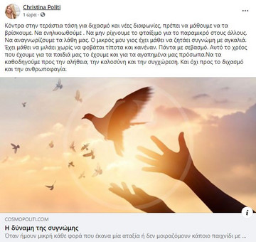 Η γνωστή δημοσιογράφος δημοσίευσε ένα κείμενο στο site cosmopoliti.com με τίτλο “Η Δύναμη της Συγγνώμης” και το αναδημοσίευσε στο Facebook σαν ανάρτηση. Εκεί έγραψε έγραψε ένα συγκινητικό μήνυμα και μοιράστηκε λόγια καρδιάς.