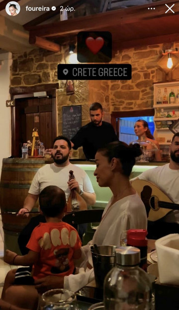 Όπως φαίνεται σε Instagram story που δημοσίευσε η ίδια, από το κρητικό γλέντι που γίνεται λίγο πριν τον γάμο του ζευγαριού, η Ελένη Φουρέιρα κρατά στην αγκαλιά της τον μικρό Ερμή και τον χορεύει ρυθμικά στις κρητικές μαντινάδες, που ακούγονται στο μαγαζί.