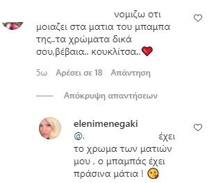Η ευτυχισμένη μανούλα, δεν δίστασε να απαντήσει στο σχόλιο μιας διαδικτυακής της φίλης και να της αποκαλύψει σε ποιον “μοιάζει” η μικρούλα. Όπως έγραψε, έχει καταγάλανα μάτια όπως τα δικά της, αλλά το βλέμμα είναι καθαρά του μπαμπά της, του Μάκη Παντζόπουλου.