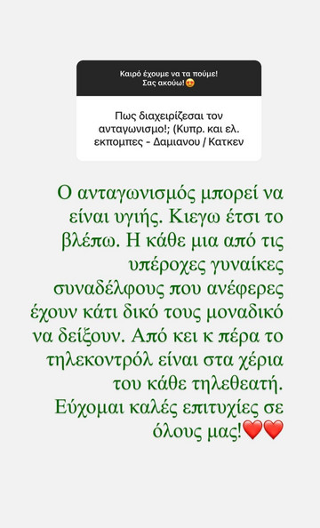 Η παρουσιάστρια μεταξύ άλλων απάντηση σε ερώτηση follower για τον πρωινό ανταγωνισμό στην τηλεόραση. Συγκεκριμένα την ρώτησαν πως διαχειρίζεται τον ανταγωνισμό με την Κατερίνα Καινούργιου και την Γιώτα Δαμιανού, αφού οι εκπομπές τους προβάλλονται την ίδια ώρα.