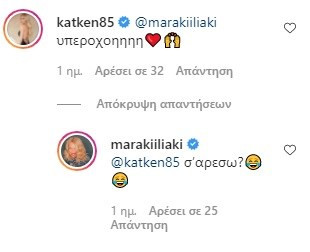 Ανάμεσα σε αυτούς που σχολίασαν τη φωτογραφία της παρουσιάστριας ήταν η Κατερίνα Καινούργιου η οποία έγραψε: “Υπέροχη”. Από την άλλη πλευρά, η Μαρία Ηλιάκη απάντησε στην παρουσιάστρια, γράφοντας: “σ’αρεσω?”