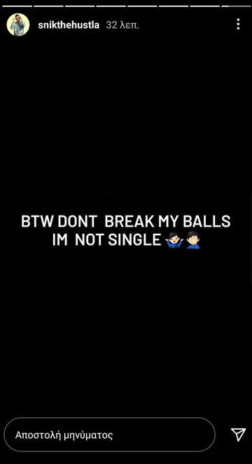 Πιο συγκεκριμένα μέσα από ρεπορτάζ πρωινής εκπομπής, ειπώθηκε ότι υπάρχουν σύννεφα στη σχέση τους με την παρουσιάστρια αρχικά να τρολάρει το γεγονός και τον τραγουδιστή να κρατά σιγή ιχθύος. Όμως, ο ίδιος έπειτα από επίμονες ερωτήσεις των ακόλουθών του για την εν λόγω φήμη απάντησε μέσα από insta story, δηλώνοντας με έντονο ύφος ότι δεν είναι μόνος.