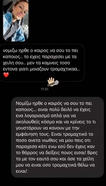 Αποτομωτική ήταν η απάντηση σε ακόλουθό της, ο οποίος μεταξύ άλλων σχολίασε τα χείλη της, τα οποία και βρήκε… τρομακτικά και ότι το έχει παρακάνει.