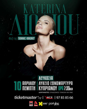 Η Κατερίνα Λιόλιου, με τη δυναμική σκηνική της παρουσία και τις αμέτρητες επιτυχίες της, θα βρεθεί στην Λευκωσία την Πέμπτη 10 Απριλίου για μια αξέχαστη μουσική βραδιά!
