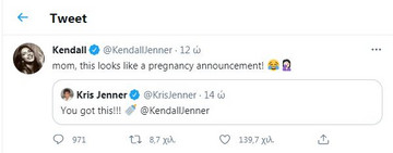 H Kendall απάντησε στο tweet, γελώντας: “Μαμά, αυτό μοιάζει με ανακοίνωση εγκυμοσύνης!”