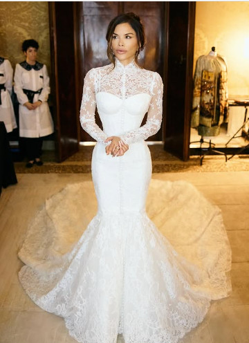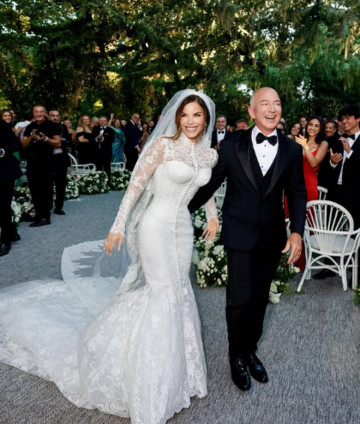 Για τη μεγάλη της μέρα, που η Λορέν Σάντσεζ ντύθηκε νυφούλα στο πλάι του ιδρυτή της Amazon Τζεφ Μπέζος, επέλεξε ένα δαντελένιο φόρεμα Dolce & Gabbana με μακριά μανίκια, στενό μπούστο, ψηλό ντεκολτέ, τεράστια ουρά και κουμπιά μπροστά.