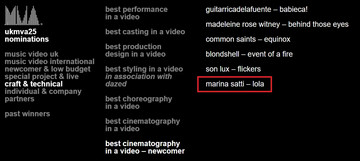 Η Μαρίνα Σάττι συνεχίζει να γράφει ιστορία στη σύγχρονη μουσική σκηνή. Για δεύτερη φορά στην καριέρα της διακρίνεται στα UK Music Video Awards, τον κορυφαίο θεσμό παγκοσμίως για το music video και το music film making: το 2022 με το “YIATI POULI’M” στην κατηγορία Best Alternative Video – Newcomer και τώρα, το 2025, επιστρέφει με το “LOLA” στην κατηγορία Craft & Technical: Best Cinematography in a Video – Newcomer.