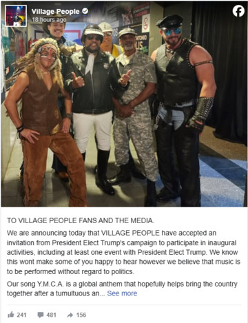 «Ξέρουμε ότι αυτό δεν θα χαροποιήσει κάποιους από εσάς να το ακούσετε, ωστόσο πιστεύουμε ότι η μουσική πρέπει να εκτελείται χωρίς να λαμβάνεται υπόψη η πολιτική», ανέφερε μια ανάρτηση στο Facebook. «Το τραγούδι μας YMCA είναι ένας παγκόσμιος ύμνος που ελπίζουμε να βοηθήσει να ενωθεί η χώρα μετά από μια ταραχώδη και διχασμένη προεκλογική εκστρατεία όπου ο υποψήφιος που προτιμούσαμε έχασε».
