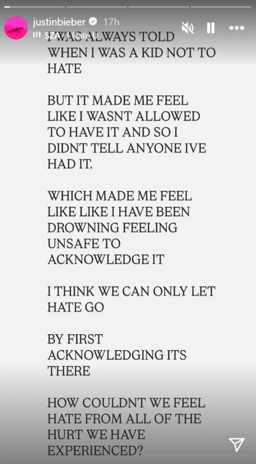 Η ανάρτηση, η οποία συνοδευόταν από το μελαγχολικό τραγούδι «I Hate U» της SZA, περιείχε ένα κείμενο με γκρι φόντο, στο οποίο ο τραγουδιστής εξέφραζε τις εσωτερικές του ανησυχίες. «Πάντα μου έλεγαν από παιδί να μη μισώ. Αλλά αυτό με έκανε να πιστεύω ότι δεν μου επιτρέπεται να το νιώσω και έτσι δεν το εξέφρασα ποτέ», ανέφερε ο Μπίμπερ.