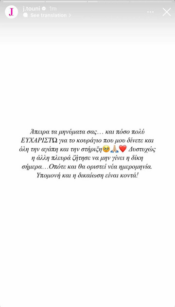 Η ανάρτησή της ήταν γεμάτη ευγνωμοσύνη και αισιοδοξία: «Άπειρα τα μηνύματά σας… και πόσο πολύ ευχαριστώ για το κουράγιο που μου δίνετε και όλη την αγάπη και την στήριξη. Δυστυχώς, η άλλη πλευρά ζήτησε να μην γίνει η δίκη σήμερα… Οπότε και θα οριστεί νέα ημερομηνία. Υπομονή και η δικαίωση είναι κοντά!», έγραψε χαρακτηριστικά.