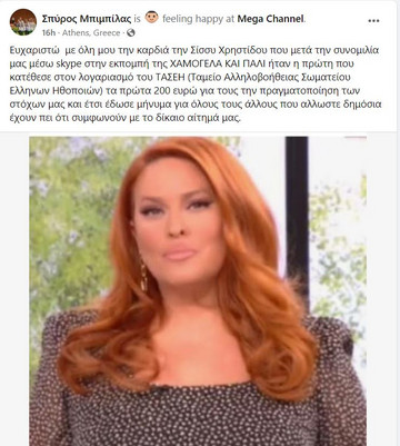 Η Σίσσυ Χρηστίδου σεβάστηκε την επιθυμία του προέδρου του ΣΕΗ, Σπύρου Μπιμπίλα και μετά την συνομιλία που είχε εκπομπή «Χαμογέλα και πάλι» μαζί του, κατέθεσε 200 ευρώ στον λογαριασμό του.
