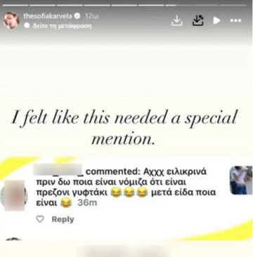 «Ένιωσα ότι αυτό άξιζε μια ειδική αναφορά», σχολίασε από την πλευρά της Σοφία Καρβέλα σε story που ανέβασε λίγο αργότερα.