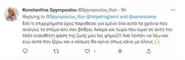 Μετά ήρθε και η απάντηση από την Κωνσταντίνα Σπυροπούλου: «Έχω και εγώ πολλά να πω πλέον όπως εσείς λέτε χωρίς καν να με ξέρετε ότι σας κατέβει, γιατί οι συνεργάτες σας όπως λέτε και εσείς τα διαδίδουν!! Υ.Γ.Την κολλητή σου εννοείς γυναίκα που χάρη σε αυτήν βρίσκεσαι εκεί που βρίσκεσαι και που καθάριζε τους πάντες για σένα».