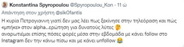 Το πρώτο tweet από την Κωνσταντίνα Σπυροπούλου ανέφερε: «Η κυρία Πετρογιαννη γιατί δεν μας λέει πως ξεκίνησε στην τηλεόραση και πώς «μπήκε» στον alpha..ερώτηση για δυνατούς λύτες αναρωτιέμαι επίσης πόσες φορές μέσα στην εβδομάδα με κάνει follow στο Instagram δεν την κάνω πίσω και με κάνει unfollow».