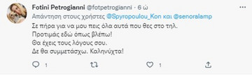 Η Φωτεινή Πετρογιάννη επανήλθε: «Κωνσταντίνα μου, ελπίζω να βρεις έστω και ΕΝΑΝ άνθρωπο να υποστηρίξει τα ψέματα που γράφεις. Καλό σου βράδυ».