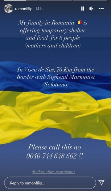 Η σχεδιάστρια Ραμόνα Φίλιπ, όπως είναι γνωστό έχει καταγωγή από την Ρουμάνια -χώρα που συνορεύει με την Ουκρανία- και η ίδια μέσα από μια ανάρτηση της στο Instagram, ενημέρωσε πως η οικογένεια της στην Ρουμάνια μπορεί να παρέχει στέγη και φαγητό σε οκτώ άτομα.
