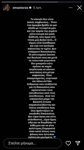 Στο Instagram Story που δημοσίευσε, ο τραγουδιστής παραδέχτηκε ότι το αλκοόλ «δεν είναι καλός σύμβουλος», τονίζοντας ότι οι αστυνομικοί έκαναν τη δουλειά τους. Έγραψε επίσης ότι δεν είναι άγιος και ότι είναι διατεθειμένος να πληρώσει για τα λάθη του.