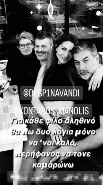 Το βράδυ της Πέμπτης, 17 Νοεμβρίου βρέθηκαν σε γνωστό εστιατόριο στον Πειραιά μαζί με τον καλό τους φίλο, Μανώλη Κονταρό. Ο ηθοποιός που πρωταγωνιστεί στην σειρά του Alpha ”Αυτή η Νύχτα Μένει” δημοσίευσε μια φωτογραφία τους με την Δέσποινα Βανδή να βρίσκεται στην αγκαλιά του!
