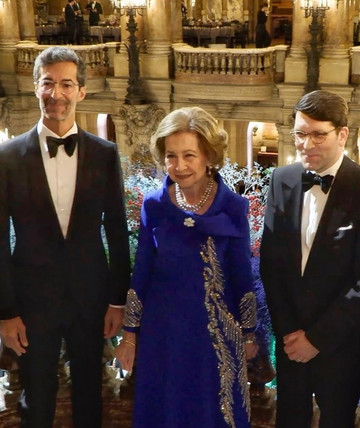 Η βασίλισσα Σοφία βρέθηκε στην Palais Garnier, ιστορική έδρα της παρισινής όπερας. Η Σοφία επέλεξε ένα κομψό μπλε φόρεμα με χρυσά διακοσμητικά, ντυμένο με μαύρη κάπα.