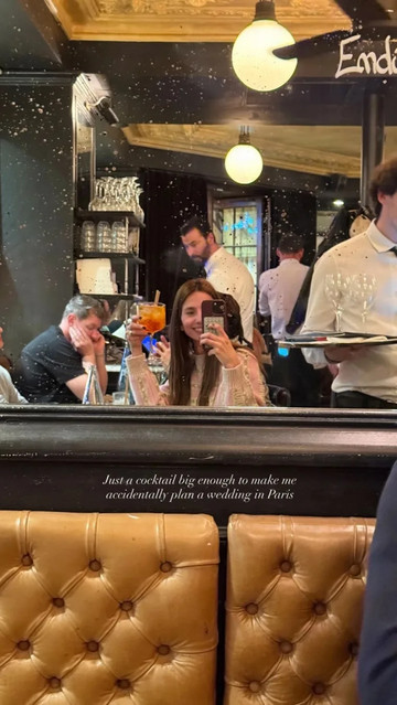 To μοντέλο και παρουσιάστρια ποζάρει μπροστά σε έναν καθρέφτη, κρατώντας ένα κοκτέιλ, χαμογελά στον φακό. Την εν λόγω φωτογραφία δημοσίευσε στο instagram της και σχολίασε: «Just a cocktail big enough to make me accidentally plan a wedding in Paris» («Απλώς ένα κοκτέιλ αρκετά μεγάλο ώστε να με κάνει κατά λάθος να αρχίσω να σχεδιάζω έναν γάμο στο Παρίσι»).