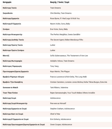 Η ταινία «Train Dreams», σε σενάριο των Greg Kwedar και Clint Bentley, ο οποίος βρέθηκε και στο σκηνοθετικό τιμόνι, με πρωταγωνιστές τους Joel Edgerton, Felicity Jones, Kerry Condon και William H. Macy, απέσπασε τα βραβεία Καλύτερης Ταινίας, Σκηνοθεσίας και Φωτογραφίας.