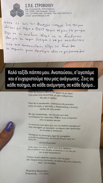 «Καλό ταξίδι, πάππο μου. Αναπαύσου, σε αγαπάμε και σε ευχαριστούμε που μας ανάδειξες. Ζεις σε κάθε ποίημα, σε κάθε ανάμνηση, σε κάθε δρόμο», έγραψε συγκινημένα, συνοδεύοντας την ανάρτηση με το ποίημα που εκείνος είχε γράψει και άφησε πίσω.
