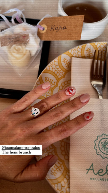 Η δημοφιλής Κύπρια ηθοποιός και ραδιοφωνική παραγωγός απόλαυσε τη μέρα της με μασάζ και brunch με φίλες και συναδέλφους της, όπως τις Κάλια Ελευθερίου, Δήμητρα Σιβρή, Μαρία Πορφυρίου, Χαριτίνη Ηλιάδου. Φυσικά, το τραγούδι ”Μηλιά” είχε την τιμητική του και η προσεχώς νυφούλα χόρεψε μαζί με τις φίλες της υπό το άκουσμα του γνωστού τραγουδιού.