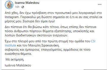 «Έχω στο πλευρό μου από την πρώτη στιγμή την ομάδα του CSI Institute και τον Μανώλη Σφακιανάκη, σοβαρούς και έμπειρους επαγγελματίες, αρμόδιους σε τόσο ευαίσθητα θέματα» σημείωσε χαρακτηριστικά η Ιωλαννα Μαλέσκου στο μήνυμα που δημοσίευσε στον προσωπικό της λογαριασμό στο Facebook.