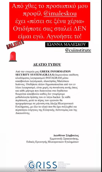Θύμα χάκερ φαίνεται πως έπεσε η Ιωάννα Μαλέσκου, η οποία και μέσω μιας ανάρτησης στον προσωπικό της λογαριασμό στο Facebook, γνωστοποίησε ότι τις τελευταίες ώρες δεν έχει πρόσβαση στον λογαριασμό της στο Instagram.