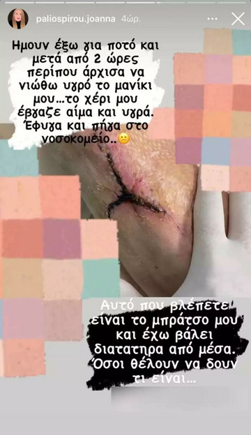 «Ήμουν έξω για ποτό και μετά από 2 ώρες περίπου άρχισα να νιώθω υγρό το μανίκι μου… Το χέρι μου έβγαζε αίμα και υγρά. Έφυγα και πήγα στο νοσοκομείο. Αυτό που βλέπετε είναι το μπράτσο μου και έχω βάλει διατατήρα από μέσα».