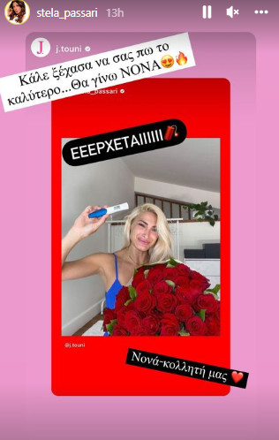 Την δημοσίευση της γνωστής influencer αναδημοσίευσαν πολλοί φίλοι της και μεταξύ αυτών και η κολλητή της φίλη και συνέταιρος στην επιχείρησή της στη Θεσσαλονίκη, Στέλα Πάσσαρη. Η κολλητή της έγραψε ”Έρχεται” με την Ιωάννα Τούνη να αναδημοσιεύει την ανάρτηση της Στέλας Πάσσαρη και να αποκαλύπτει πως αυτή θα είναι η νονά του μωρού της.
