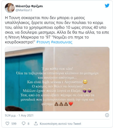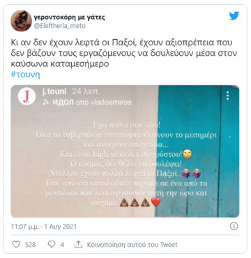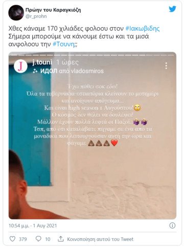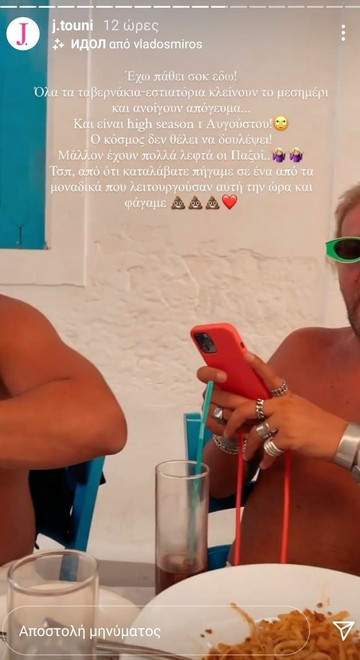 “Έχω πάθει σοκ εδώ. Όλα τα ταβερνάκια εστιατόρια κλείνουν το μεσημέρι και ανοίγουν το απόγευμα. Και είναι hight season 1 Αυγούστου. Ο κόσμος δεν θέλει να δουλέψει. Μάλλον έχουν πολλά λεφτά οι Παξοί Τέλος πάντων, απ΄ότι καταλάβατε πήγαμε σε ένα από τα μοναδικά που λειτουργούσαν αυτή την ώρα και φάγαμε”, έγραψε σε story της στο Instagram, προκαλώντας αντιδράσεις στους χρήστες των social media.