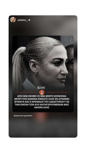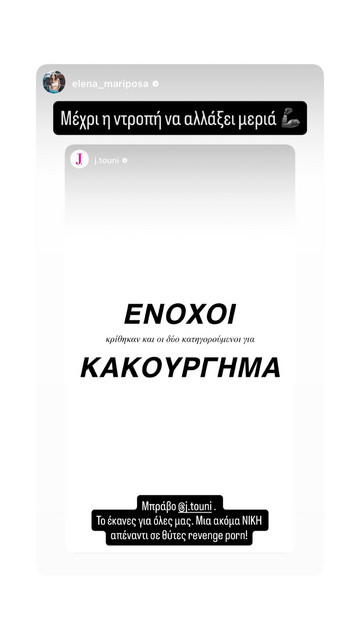 Ευχαριστώ τόσο πολύ για όλη την στήριξη και την αγάπη που πήρα αυτό το διάστημα από όλες σας. Μου δώσατε απίστευτη δύναμη να συνεχίσω να μάχομαι… ακόμη και όταν δεν ήξερα αν έχω πια το κουράγιο! Ευχαριστώ επίσης τους φίλους μου, που είναι πάντα πλάι μου και μου έχουν σταθεί πιο πολύ και από οικογένεια! Τέλος, θέλω να ευχαριστήσω θερμά τους δικηγόρους μου Μιχάλη Δημητρακόπουλο & Φρόσω Κουτσαντωνάκη… χωρίς αυτούς δεν θα είχα καταφέρει ποτέ να φτάσω μέχρι εδώ…