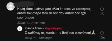 Συγκεκριμένα, κάτω από ένα βίντεο που δημοσίευσε, μία από τις ακολούθους της σχολίασε: «Καλή είσαι, Ιωάννα μου, αλλά έπρεπε να κρατήσεις αυτόν τον άντρα που άλλον σαν αυτόν δεν έχει κορίτσι μου».