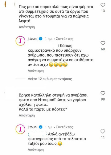 Το όνομα της Ιωάννας Τούνη, που είχε επισκεφθεί πρόσφατα το Ντουμπάι, άρχισε να αναφέρεται από κάποιους στα social media σε σχέση με το σκάνδαλο, ειδικά μετά από μια φωτογραφία που δημοσίευσε στον προσωπικό της λογαριασμό στο Instagram την Τετάρτη 9 Απριλίου.