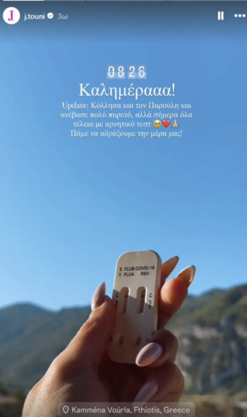 Η instagrammer ανέβασε story από τα Καμένα Βούρλα που ταξίδεψε με τον Δημήτρη Αλεξάνδρου και έδειξε στους ακολούθους της το self test που έκανε, το οποίο είναι αρνητικό. Όπως ανέφερε στην ανάρτηση, ο γιος της, Πάρης, ανέβασε πολύ πυρετό από τον κορωνοϊό.
