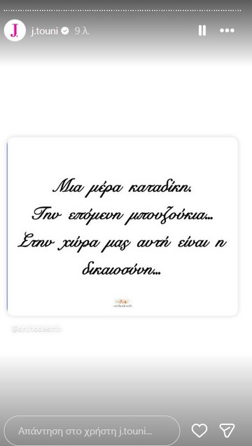 Η influencer ανάρτησε ένα στιγμιότυπο που γράφει “Την μια μέρα καταδίκη, την άλλη μπουζούκια. Αυτή είναι η δικαιοσύνη μας”.