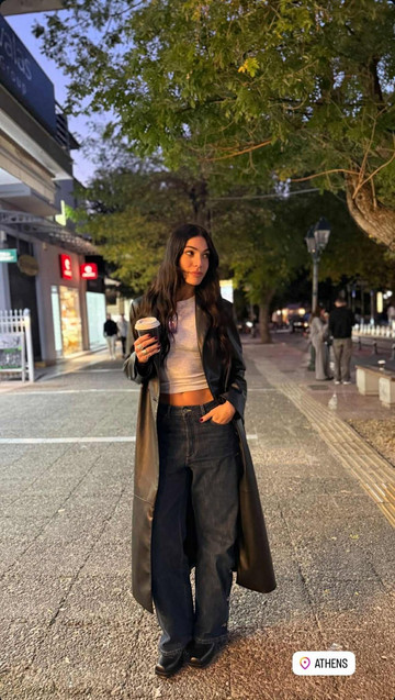 Σε ένα από τα στιγμιότυπα, η Κύπρια καλλιτέχνις ποζάρει χαμογελαστή, αναδεικνύοντας το casual αλλά κομψό outfit της, ιδανικό για μια άνετη βόλτα στην πόλη.