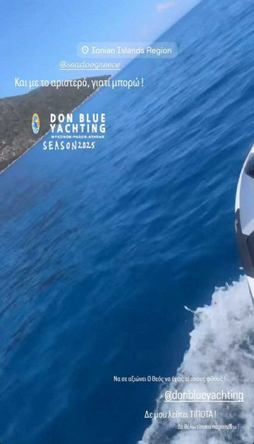 Αυτές τις ημέρες ταξιδεύει με σκάφος σε νησιά του Ιονίου, έχοντας μαζί της καλούς φίλους, στους οποίους μάλιστα αφιέρωσε ένα story γεμάτο συγκίνηση: «Να σε αξιώνει ο Θεός να έχεις τέτοιους φίλους! Δεν μου λείπει τίποτα, δεν θέλω τίποτα παραπάνω», έγραψε, με φόντο το καταγάλανο της θάλασσας.