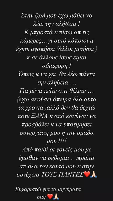 «Στη ζωή μου έχω μάθει να λέω την αλήθεια! Και μπροστά και πίσω από τις κάμερες. Γι’ αυτό κάποιοι με έχετε αγαπήσει (άλλοι μισήσει) και σε άλλους ίσως είμαι αδιάφορη. Όπως και να ‘χει, θα λέω πάντα την αλήθεια. Για μένα πείτε ό,τι θέλετε, έχω ακούσει άπειρα όλα αυτά τα χρόνια.