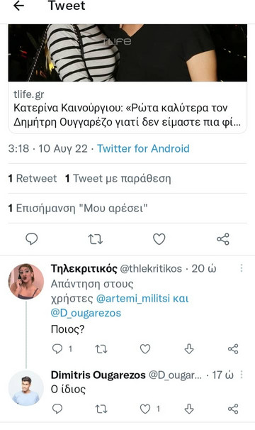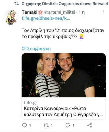 Ωστόσο, ο Ουγγαρέζος δεν σχολίασε τα όσα είπε η Καινούργιου, παρά μόνο έκανε ένα μικρό σχόλιο στο Twitter. Συγκεκριμένα, χρήστης του twitter έκανε repost ένα άρθρο με το θέμα και έγραψε ”Τον Απρίλη του 2021 ποιος διαχειριζόταν το προφίλ της ακριβώς;” και έκανε ταγκ τον Δημήτρη Ουγγαρέζο.