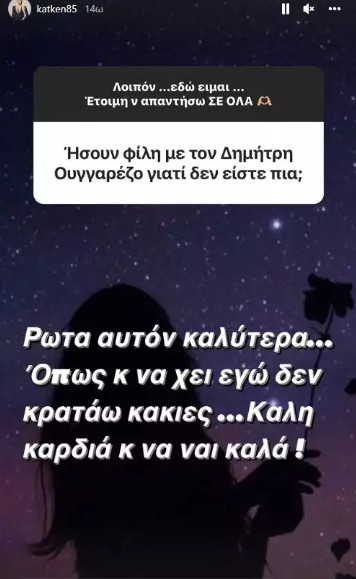 «Ήσουν φίλη με τον Δημήτρη Ουγγαρέζο, γιατί δεν είστε πια;», ρώτησε ένας follower της με την ίδια να απαντάει «Ρώτα αυτόν καλύτερα… Όπως και να ‘χει, εγώ δεν κρατάω κακίες… Καλή καρδιά και να είναι καλά»