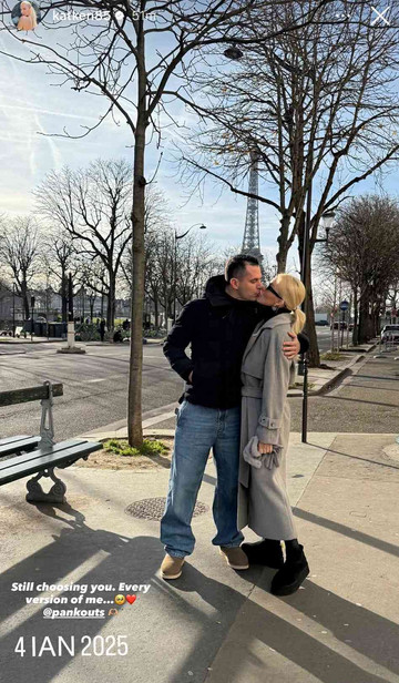 Και στις δύο φωτογραφίες οι δυο τους ποζάρουν αγκαλιά, ενώ στη μία από αυτές, η οποία τραβήχτηκε τον περασμένο Ιανουάριο στην αγαπημένη πόλη της Κατερίνας Καινούργιου, το Παρίσι, το ζευγάρι ανταλλάσσει ένα τρυφερό φιλί μπροστά στον φακό.