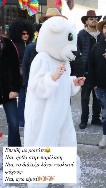 Αν και οι θερμοκρασίες ήταν χαμηλές, εκείνη κατάφερε να εντυπωσιάσει με την ιδιότυπη στολή της, ντυμένη ως πολική αρκούδα. Από τα στιγμιότυπα που κυκλοφόρησαν στα κοινωνικά δίκτυα, φαίνεται να το διασκέδασε στο έπακρο, με κανέναν να μην μπορεί να την αναγνωρίσει.