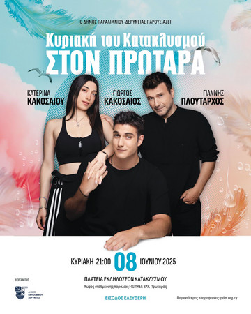 Στο πλαίσιο των εκδηλώσεων για την Κυριακή του Κατακλυσμού, ο Γιάννης Πλούταρχος, πλαισιωμένος από τον γιο του Γιώργο Κακοσαίο και την κόρη του Κατερίνα Κακοσαίου, ανεβαίνει στη σκηνή στην Πλατεία Εκδηλώσεων Κατακλυσμού, στον χώρο στάθμευσης της παραλίας Fig Tree Bay, για μία μοναδική μουσική βραδιά.