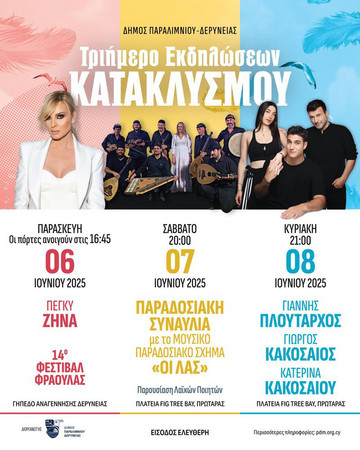 Ο Δήμος Παραλιμνίου – Δερύνειας διοργανώνει την καθιερωμένη μεγάλη συναυλία για την Κυριακή του Κατακλυσμού 2025 στον Πρωταρά. Οι Γιάννης Πλούταρχος, Γιώργος Κακοσαίος και η Κατερίνα, μας προσκαλούν σε ένα απίστευτο καλοκαιρινό πάρτι παίρνοντας την σκυτάλη από την Πέγκυ Ζήνα αλλά και τους παραδοσιακούς λαϊκούς ποιητές στην παραλία Fig Tree. Η συναυλία θα πραγματοποιηθεί την Κυριακή 8 Ιουνίου 2025, στις 9 το βράδυ, στην πλατεία εκδηλώσεων Κατακλυσμού (χώρος στάθμευσης παραλίας Fig Tree Bay στον Πρωταρά)