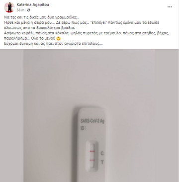 Ωστόσο, σήμερα Τρίτη 5 Ιουλίου η Κατερίνα Αγαπητού με ανάρτησή της στον προσωπικό της λογαριασμό ανακοίνωσε ότι διαγνώστηκε θετική στον κορωνοϊό και μάλιστα έχει έντονα συμπτώματα. Όπως έγραψε χαρακτηριστικά, «Να τες και τις δικές μου δυο γραμμούλες… Ήρθε και μένα η σειρά μου…. Δε ξέρω πως μας… “επιλέγει” πάντως εμένα μου τα έδωσε όλα… ίσως από τα δυσκολότερα βράδια. Ασήκωτο κεφάλι, πόνος στα κόκαλα, ψηλός πυρετός με τρέμουλο, πόνος στο στήθος, βήχας, παραλήρημα… Όλο το μενού. Εύχομαι δύναμη και ας πάει στον αγύριστο επιτέλους….».