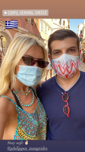 Η ίδια απαθανάτισε τη στιγμή και ανέβασε μια σέλφι εικόνα με τον επιχειρηματία, όπου ποζάρουν μαζί και αγαπημένο στη κάμερα, φορώντας τις μάσκες τους, παρακινώντας έτσι και τους ακόλουθους της Κατερίνα Καινούργιου.